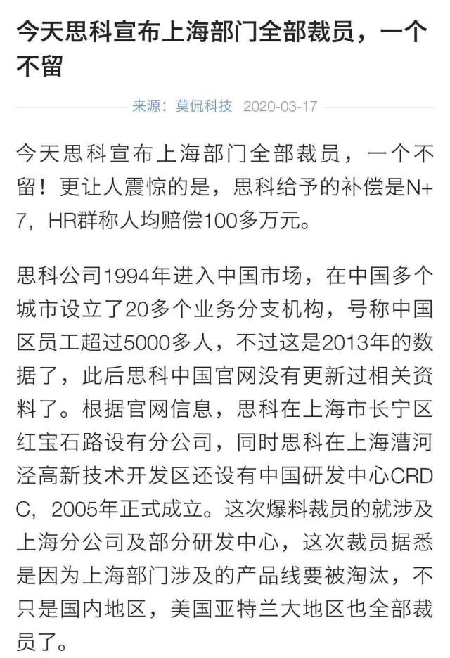 这也不是思科上海第一次传出裁员,早在2019年8月1日,《IT时报》记者前往位于上海长宁区东银中心思科办公室证实,上海裁员人数为300人左右,被裁员工按照N+7的标准赔偿。