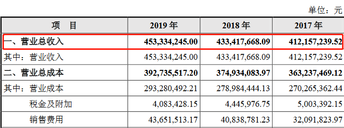 资金数据显示,2017年-2019年,营业收入分别为4.12亿元、4.33亿元、4.53亿元,净利润分别为0.43亿元、0.54亿元、0.53亿元。