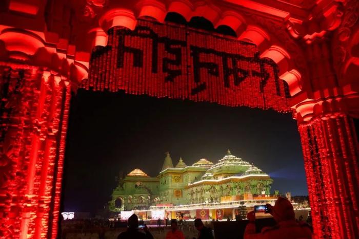 在印度北方邦阿约提亚建成的罗摩神庙夜景。