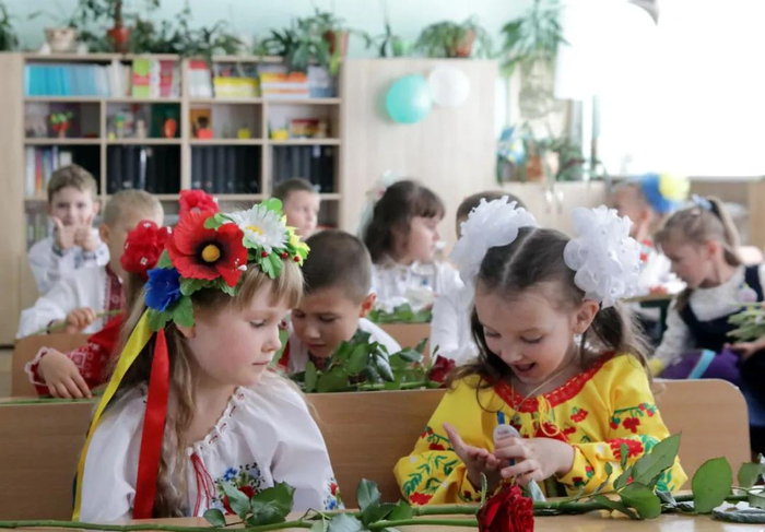 2025年9月1日,位于乌克兰基辅州维什涅韦市的一所学校举行新学年开学典礼,一年级学生身着民族服装坐在教室参加首次钟声仪式。