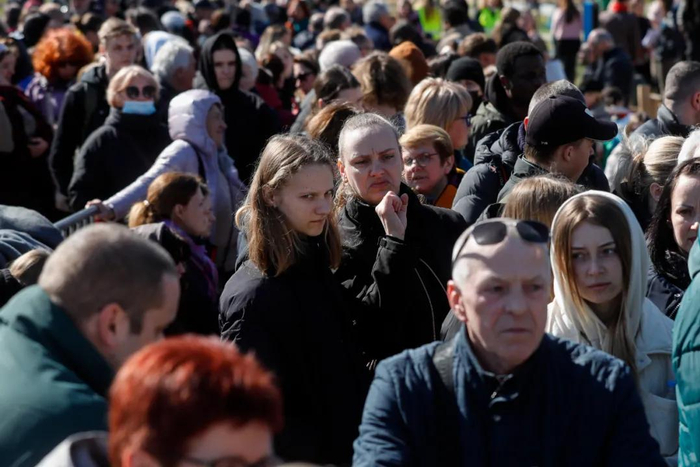 2022年3月18日,大批从乌克兰逃离的难民在比利时布鲁塞尔移民中心办公室外排队等待登记。