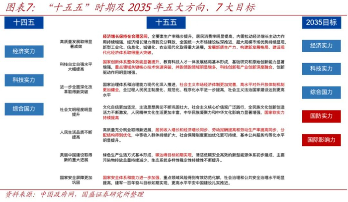 整体看,“十五五”有两大基调,其一是聚焦“五个方向、七大目标”。“十四五”期间,中国经济实力、科技实力、综合国力跃上新台阶,“十五五”作为承上启下的关键时期,是2035年实现我国经济实力、科技实力、国防实力、综合国力和国际影响力大幅跃升的必经之路,其中国防实力、国际影响力新增表述值得关注。为实现2035的五大远景目标,“十五五”提出7个具体目标:经济高质量发展、科技自立自强、全面深化改革、社会文明提升、人民生活提质、建设美丽中国、巩固国家安全。后续,各部委、各地方政府等将围绕这些方向部署各项工作安排,落实相关规划要求。