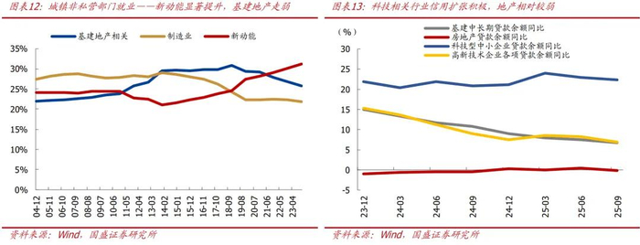 >就业视角:随着经济新动能的崛起,其吸纳就业的规模也在显著提升,根据城镇非私营单位就业数据来看,以三供一业、建筑业、交运仓储、金融、房地产、水利环保为代表的基建地产相关行业,就业人数逐年下降,2023年达到4226万人,占全体比重为25.8%,相比之下,以软信、商服租赁、科技服务、居民服务、教育、社卫工作、文体娱乐为代表的经济新动能吸纳就业快速提升,2023年已经突破5100万人,占全体比重达到31.2%。倾向于认为,参照“十五五”规划的发展路径,“十五五”期间随着现代化产业体系的进一步发展,经济新动能相关的就业比重将进一步提升。