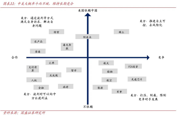 3)中美关系的背后,是中美在科技、经贸、军事、制造业、人权、能源、航空、投资、金融、汇率、禁毒、稀土、芯片、农产品、旅游等一系列领域的竞争、合作关系,其中竞争性领域出现摩擦难以避免,谈判交流重在避免摩擦升级、管控分歧、增加互信,合作性领域则是谈判和利益交换的重要“筹码”。