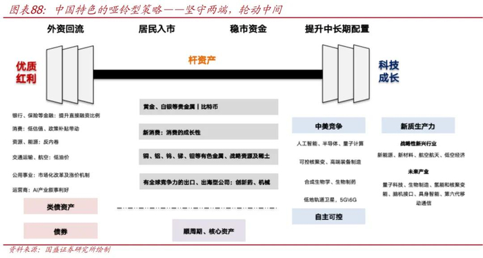 具体看,我们提出中国特色的哑铃型策略,将是较好的配置方式,两端是配置重点方向,中间杆资产适当做轮动: