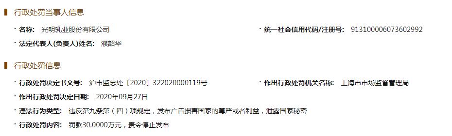 国家企业信用信息公示系统显示,光明乳业股份有限公司因违反第九条第(四)项规定,发布广告损害国家的尊严或者利益,泄露国家秘密,被上海市市场监督管理局作出罚款30万元,责令停止发布的行政处罚。