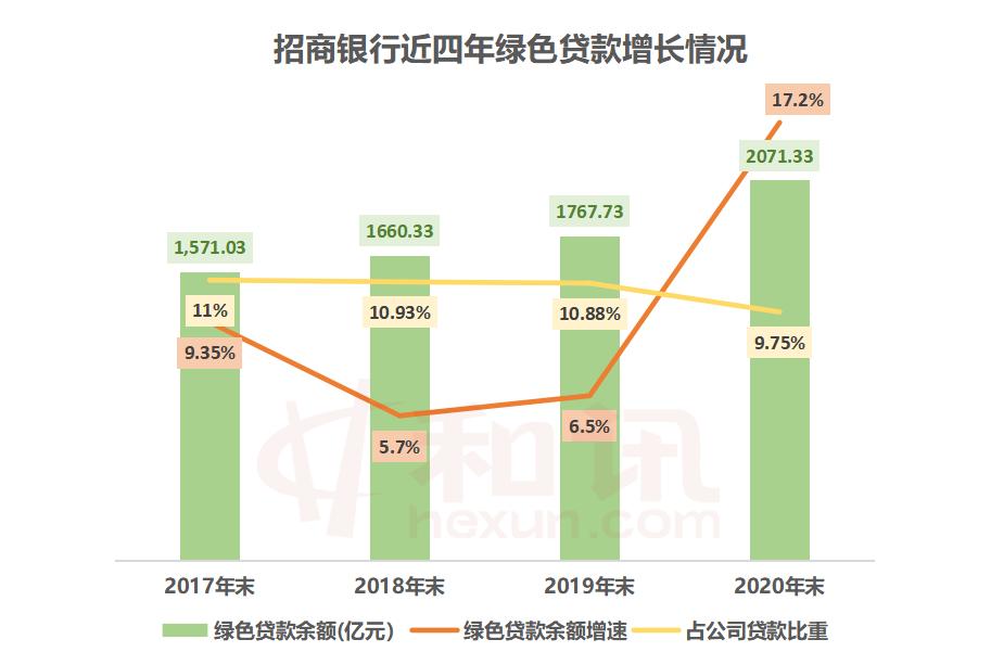 年报显示,截至2020年末,招行绿色贷款余额2071.33亿元,较上年末增加303.60亿元,占公司贷款总额的11.78%,同时高于公司贷款及垫款增速8.88个百分点。其中支持节能环保项目69个,节能环保项目贷款余额82.27亿元,同比增长109.13%。