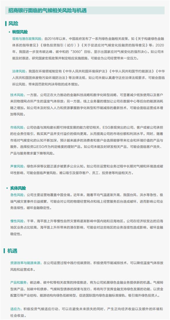 面对疫情带来的启示,招行对自身面临的气候变化风险与机遇,做出了识别和评估。
