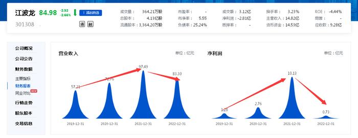 公开数据显示,江波龙2019年度—2022年度,营收分别为:57.21亿元、72.76亿元、97.49亿元、83.30亿元;同期,净利润分别为:1.28亿元、2.76亿元、10.13亿元、0.73亿元。