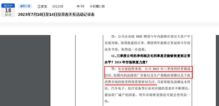 尽管目前江波龙尚未披露半年报预告,但其在7月份的投资者关系活动表中透露了三季报的“困境”。