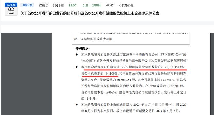 据江波龙8月2日披露的《关于首次公开发行前已发行的部分股份及首次公开发行战略配售股份上市流通提示性公告》,本次解除限售的股份为首次公开发行前已发行的部分股份及首次公开发行战略配售股份,本次解除限售股东户数共计 17 户,解除限售股份的数量合计 78,901,954 股,占公司总股本的 19.1109%。