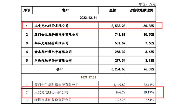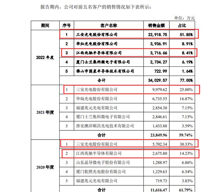 2020年度-2022年度,三安光电、江西兆驰半导体有限公司均为矽电股份的前五大客户之一(注: 2021年度,江西兆驰半导体有限公司未进入前五名客户名单)。并且,需要注意的是,期间,三安光电均作为第一大客户,为矽电股份贡献大份额业绩,其中2022年度更是贡献了过半营收。