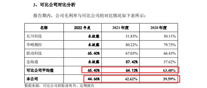 另外,需要注意的是,矽电股份的毛利率远低于同行可比公司均值。根据招股书,2020年-2022年,矽电股份的综合毛利率分别为:39.59%、42.62%、44.66%。而同行可比公司的金海通、联动科技、长川科技(300604)、华峰测控在2020年、2021年的毛利率均远远超过矽电股份。其中,华峰测控在2020年、2021年的毛利率更是分别高达:79.75%、80.22%,几乎为矽电股份同期的两倍。