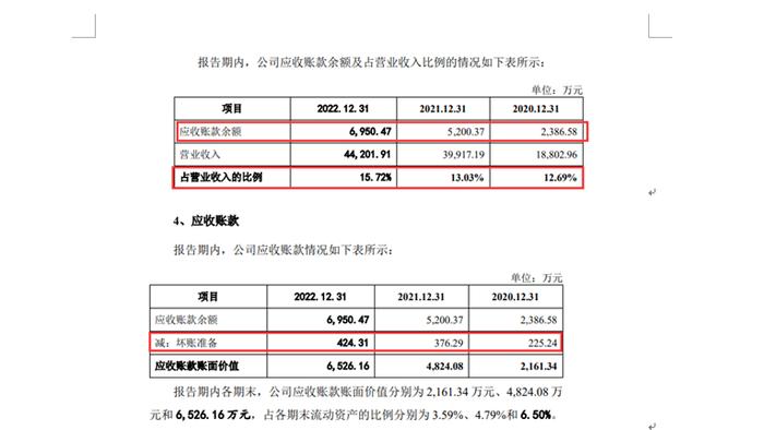 不过,需要注意的是,在上述两名关联人入股后,三安光电、江西兆驰半导体有限公司营收贡献大增的同时,矽电股份的应收账款也在增长。2020年-2022年末,矽电股份的应收账款余额分别为:2,386.58万元、5,200.37万元、6,950.47万元,占当期营收比例分别为:12.69%、13.03%、15.72%。
