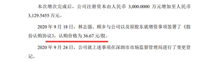 第三次增资,2020 年 9 月增资。林志强、顾乡分别出资2,750.0000 万元认购 75.0000 万股,顾乡以货币方式出资 2,000.0000 万元认购54.5455 万股,现有股东放弃优先认购权。认购价格为 36.67 元/股。