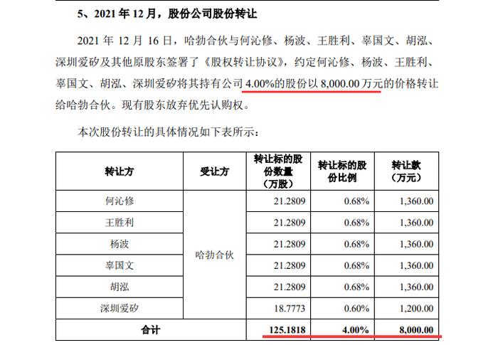 第二次股权转让:2021 年 12 月,股份公司股份转让(注:2019 年 12 月,整体变更为股份有限公司)。哈勃合伙与何沁修、杨波、王胜利、辜国文、胡泓、深圳爱矽及其他原股东签署了《股权转让协议》,约定何沁修、杨波、王胜利、辜国文、胡泓、深圳爱矽将其持有公司 4.00%的股份(即125.1818万股)以 8,000.00万元的价格转让给哈勃合伙。按照8,000.00万元除以125.1818万股,即每股约63.91元。