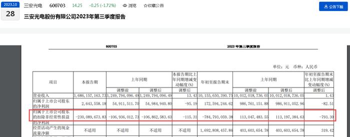 需要指出的是,三安光电今年前三季度出现了亏损,即前三季度,归母扣非净利润录得:-7.85亿元,同比下滑793.30%。