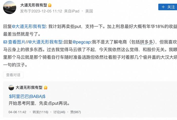 段永平同时引用了他在今年4月发布的一条雪球内容,“开始思考阿里,先卖点put再说”,据其晒出的两张成交图片显示当时先后卖出两份999张的put。此次计划卖出是再次看涨,并且他同时还表示计划还要再卖些(阿里)put,支持一下。