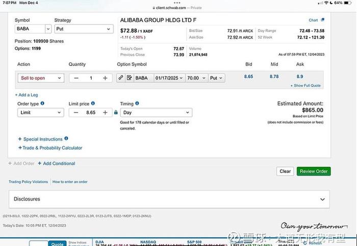 12月5日,被称为“中国巴菲特”的投资大师段永平在社交平台晒出一张成交图片,由于看好阿里巴巴股价未来表现,其于美国时间12月4日晚7点计划交易阿里“看跌期权(put option)”,单张对应权利金865美元,但具体期权数量未公布。