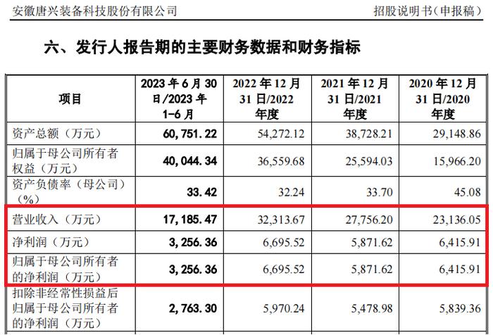 2020年至2022年,唐兴装备实现营业收入分别为2.31亿元、2.78亿元、3.23亿元,同期实现归母净利润分别为6415.91万元、5871.62万元、6695.52万元。