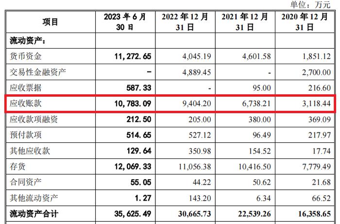 2020年至2022年和2023年1-6月,唐兴装备的应收账款分别为3118.44万元、6738.21万元、9404.20万元和10783.09万元,占流动资产的比例分别为19.06%、29.90%、30.67%和 30.27%,金额较大。