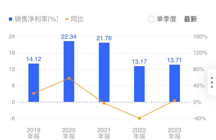 2023年,其销售净利率为13.71%,虽然在2022年大幅下降39.48%的基础上回调至同比增长4.09%,但仍是低于近五年以来的次低水平。