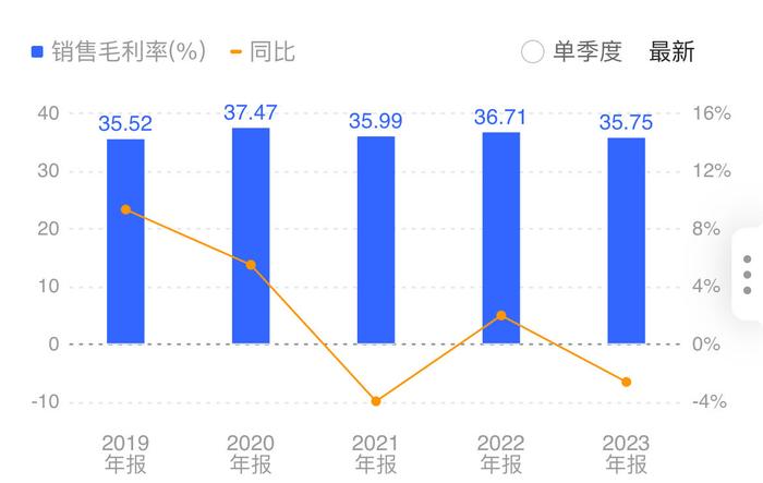 同时,其销售毛利率为35.75%,较去年同期下降0.96个百分点,为近四年最低值。