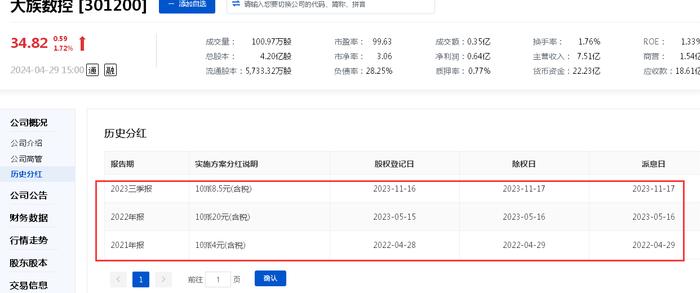 其中,大族数控2021年年度权益分派现金共计1.68亿元、2022年年度权益分派现金共计8.40亿元、2023年前三季度权益分派现金共计3.57亿元。而相应报告期,大族数控录得净利润分别为:6.99亿元、4.35亿元、1.59亿元,合计12.93亿元。而上述分红总额远超该盈利总额。