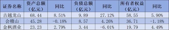 截至2023年12月31日,古越龙山的资产总额约为68.44亿元,同比增长8.51%;负债总额约为9.89亿元,同比增长27.12%;所有者权益约为58.55亿元,同比增长5.90%。会稽山的资产总额约为45.28亿元,同比下降0.18%;负债总额约为8.57亿元,同比增长4.26%;所有者权益约为36.71亿元,同比下降1.18%。金枫酒业的资产总额约为23.23亿元,同比增长2.79%;负债总额约为3.44亿元,同比下降6.01%;所有者权益约为19.79亿元,同比增长4.49%。