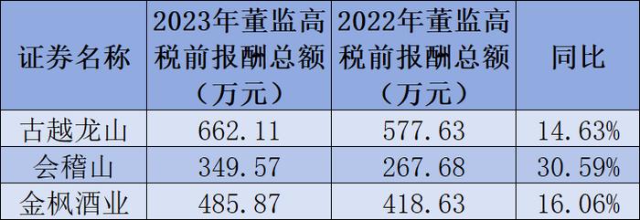 2023年,古越龙山、会稽山、金枫酒业的董监高税前报酬分别为662.11万元、349.57万元、485.87万元,分别较2022年的577.63万元、267.68万元和418.63万元同比增长14.63%、30.59%、16.06%。