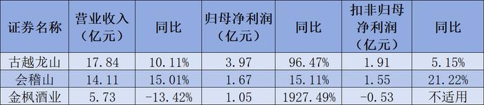 2023年,古越龙山实现营业收入约17.84亿元,同比增长10.11%;归母净利润约3.97亿元,同比增长96.47%;扣非归母净利润约1.91亿元,同比增长5.15%。会稽山实现营业收入约14.11亿元,同比增长15.01%;归母净利润约1.67亿元,同比增长15.11%;扣非归母净利润约1.55亿元,同比增长21.22%。金枫酒业实现营业收入约5.73亿元,同比下降13.42%;归母净利润约为1.05亿元,同比增长1927.49%;但是扣非归母净利润是亏损的,为-0.53亿元。