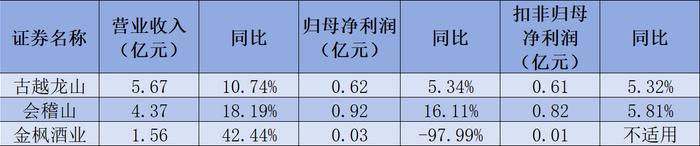 2024年一季度,古越龙山实现营业收入约5.67亿元,同比增长10.74%;归母净利润约0.62亿元,同比增长5.34%;扣非归母净利润约为0.61亿元,同比增长5.32%。会稽山实现营业收入约4.37亿元,同比增长18.19%;归母净利润约0.92亿元,同比增长16.11%;扣非归母净利润约0.82亿元,同比增长5.81%。金枫酒业实现营业收入约1.56亿元,同比增长42.44%;归母净利润约为267.29万元,同比下降97.99%;扣非归母净利润约为127.36万元,同比不适用。