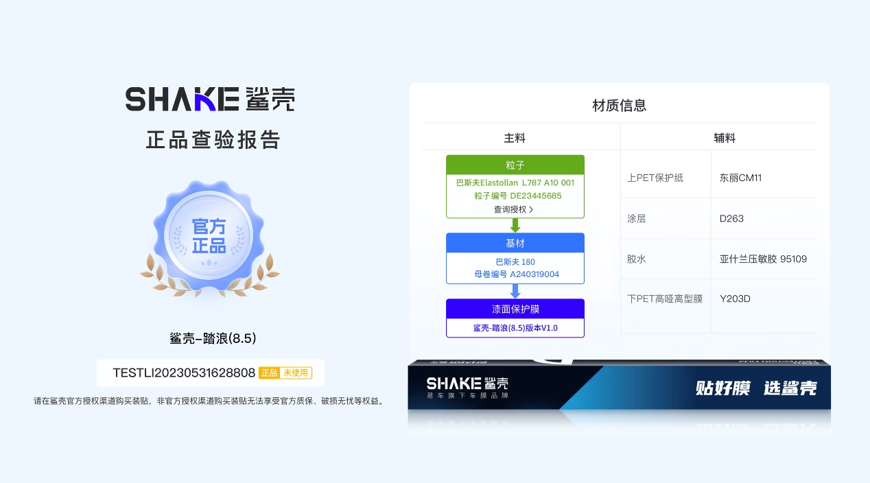 巴斯夫的 TPU 材料经过 5000+ 小时极端严苛的环境模拟测试,为鲨壳产品的十年质保提供有力保障,且巴斯夫的TPU材料完全符合欧盟的 RoHS和REACH安全标准。在易车自建的专业实验室中,鲨壳汽车性能膜也已经历 1500+ 小时的全方位质量测试,测试时长行业领先。此外,鲨壳产品还通过了国务院国资委旗下国检集团及国际权威检验机构 SGS 的检测。