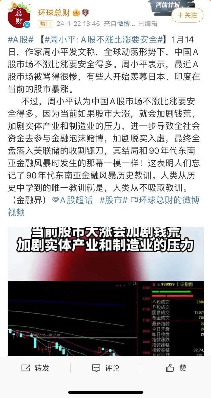 今年开年以来,A股持续下调,一度跌破2800点。周小平发文称,A股不涨比上涨安全的多........