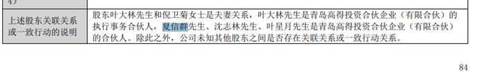 2023年年报中,泰林生物在股东关联关系或一致行动人的说明中披露,股东叶大林和倪卫菊是夫妻关系,叶大林是高得投资执行事务合伙人,夏信群、沈志林、叶星月是高得投资的合伙人。