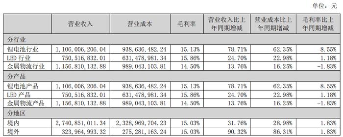 蔚蓝锂芯的LED业务报告期内实现营收7.51亿元,同比增长24.70%;毛利率为15.86%,同比增长1.18个百分点。