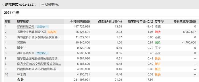 香港中央结算有限公司(陆股通,俗称北向资金)在2024年二季度也对蔚蓝锂芯进行了增持,从1927.3004万股增加到2532.5691万股,增持股数约605.2687万股,位列第2大流通股股东。