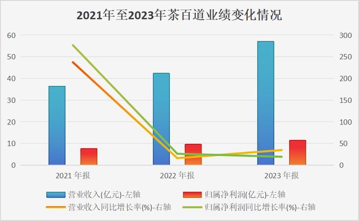 2021年至2023年,茶百道实现营收分别为36.44亿元、42.32亿元和57.04亿元,分别同比增长237.40%、16.12%和34.80%;实现归属净利润分别为7.56亿元、9.54亿元和11.39亿元,分别同比增长276.82%、26.26%和19.37%。