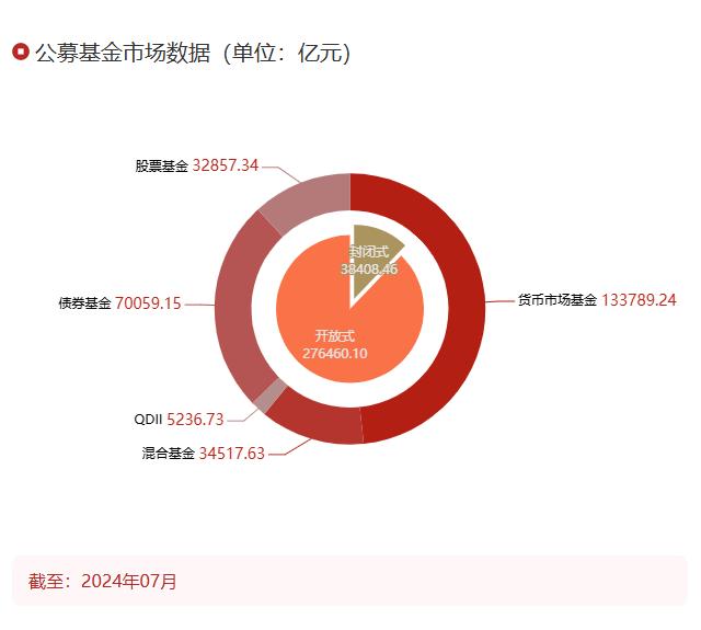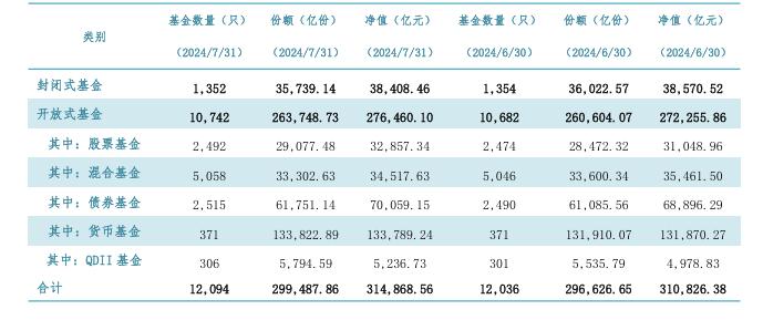 仔细一看,非也非也,混合型基金的规模只有3.45万亿,环比缩水了2.66%。但是,除了混合基金,其他类型的基金产品规模环比都有不同程度的增长,其中,得益于纳斯达克指数坚挺的表现以及国家队对于沪深300ETF的鼎力托举,QDII基金和股票ETF类基金的涨幅最大,环比增长5.18%和5.82%;债券基金和货币基金规模涨幅相对较小,但是绝对资金量增长巨大,截止到七月底,债券基金在管规模达到了7.01万亿,货币基金在管规模达到了13.38万亿,二者合计在管规模超过20万亿,规模庞大。