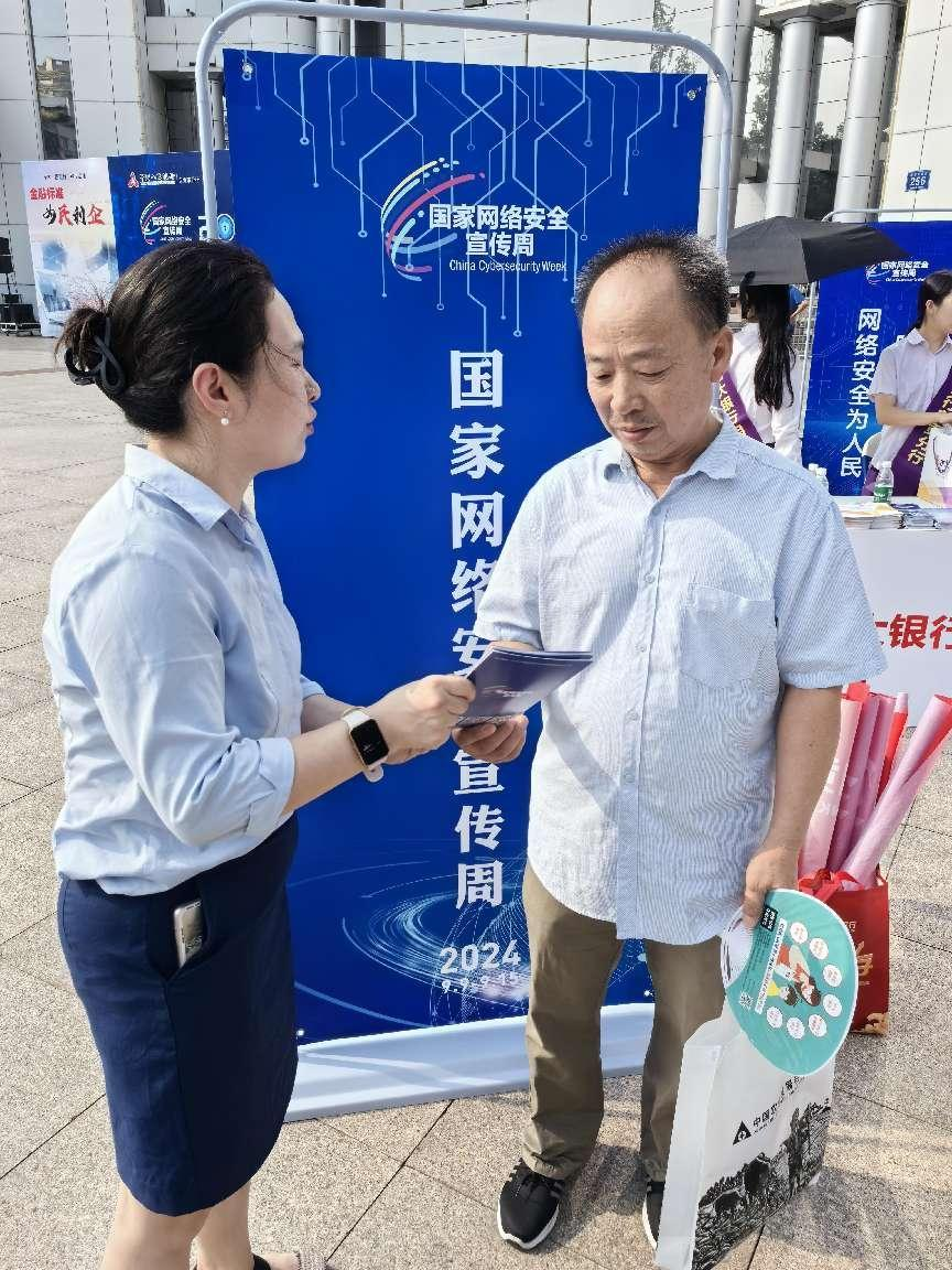自贡银行充分利用物理网点及多媒体资源,线上线下开展多渠道的宣传活动:一是利用各营业网点的LED电子显示屏、南湖逸都户外LED广告屏和人人乐户外LED广告屏等滚动播放本次网络安全宣传周标语,积极营造良好的舆论氛围;二是在各营业网点大厅发放并宣讲网络安全宣传手册,张贴海报,有效揭露网络安全诈骗常用的手段和方法;三是利用自贡银行官方微信公众号,扩大线上网络宣传的覆盖面,发动广大群众营造安全健康文明的网络环境;四是在网络安全宣传周期间,组织宣传小分队前往龙凤山社区等地宣传网络安全知识。