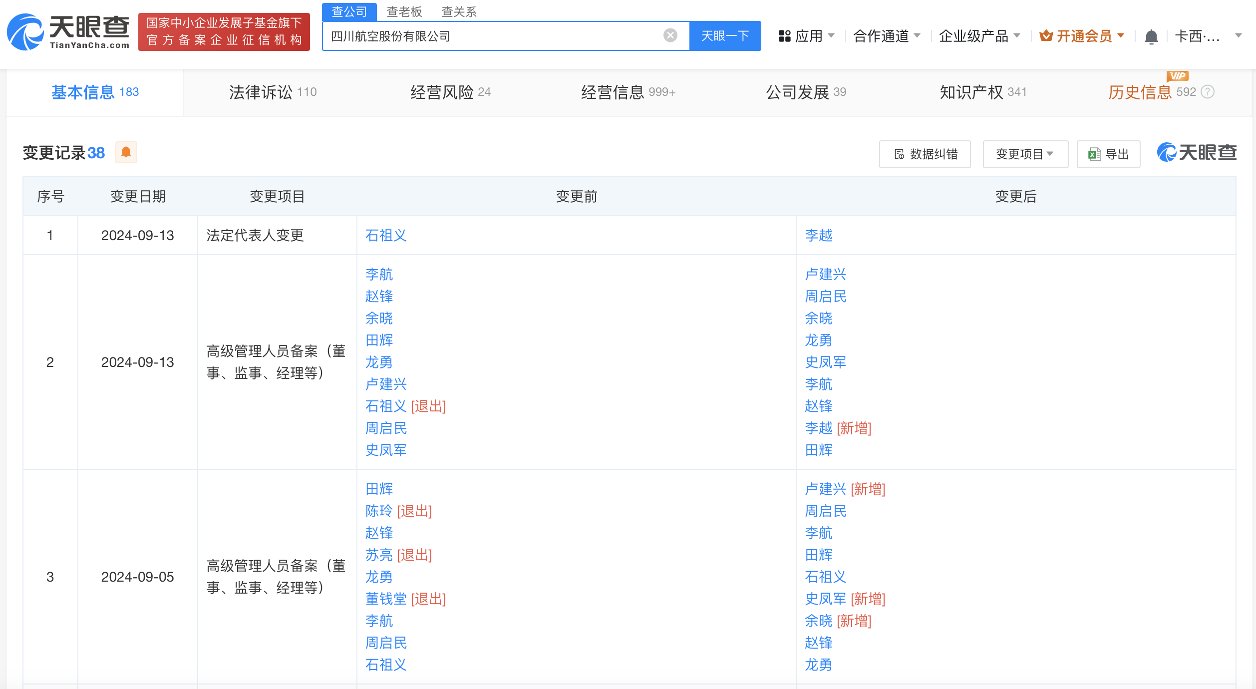 天眼查App显示,近日,四川航空股份有限公司发生工商变更,石祖义卸任法定代表人、董事长,由李越接任,同时多位主要人员也发生变更。