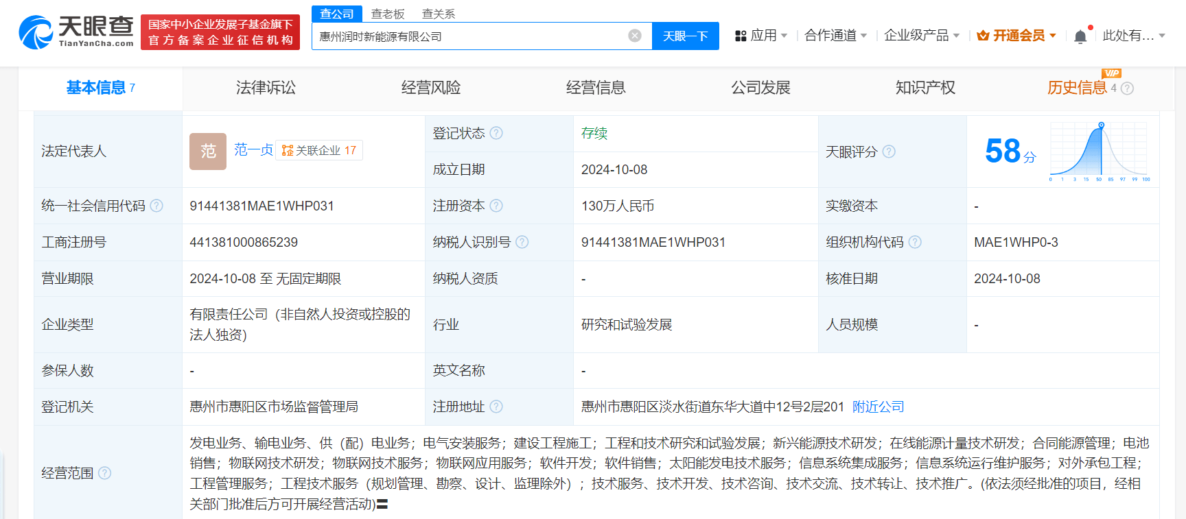 天眼查App显示,近日,惠州润时新能源有限公司成立,法定代表人为范一贞,注册资本130万人民币,经营范围含发电业务、输电业务、供(配)电业务,电气安装服务,建设工程施工,工程和技术研究和试验发展,新兴能源技术研发,在线能源计量技术研发,合同能源管理等。股权全景穿透图显示,该公司由时代绿色能源有限公司全资持股,后者为宁德时代(300750)全资子公司。