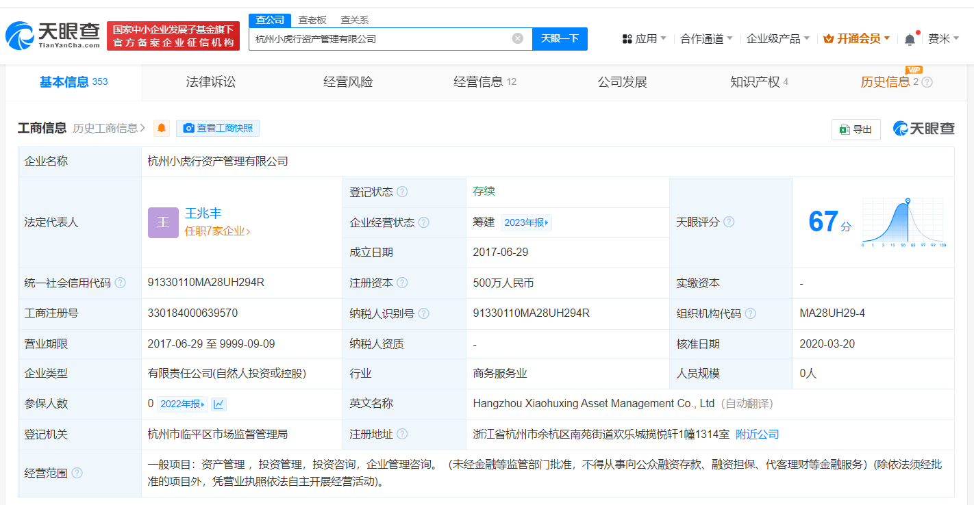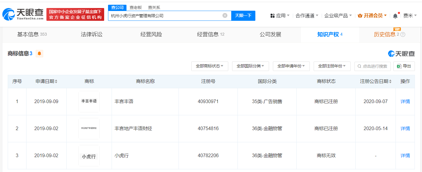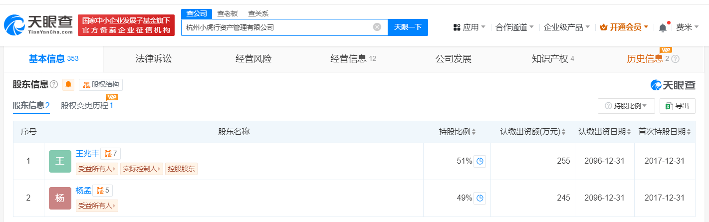 天眼查App显示,杭州小虎行资产管理有限公司成立于2017年6月,法定代表人为王兆丰,注册资本500万人民币,经营范围包括资产管理、投资管理、投资咨询、企业管理咨询,由王兆丰、杨孟共同持股。知识产权信息显示,该公司已成功注册“丰言丰语”“丰言地产丰语财经”商标,其于2019年9月申请的“小虎行”商标已被驳回,现处于无效状态。关联企业信息显示,王兆丰、杨孟二人名下还关联了多家名为“丰言丰语”“小虎行”的公司。