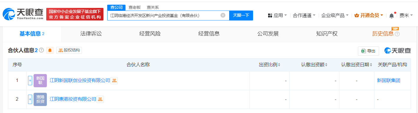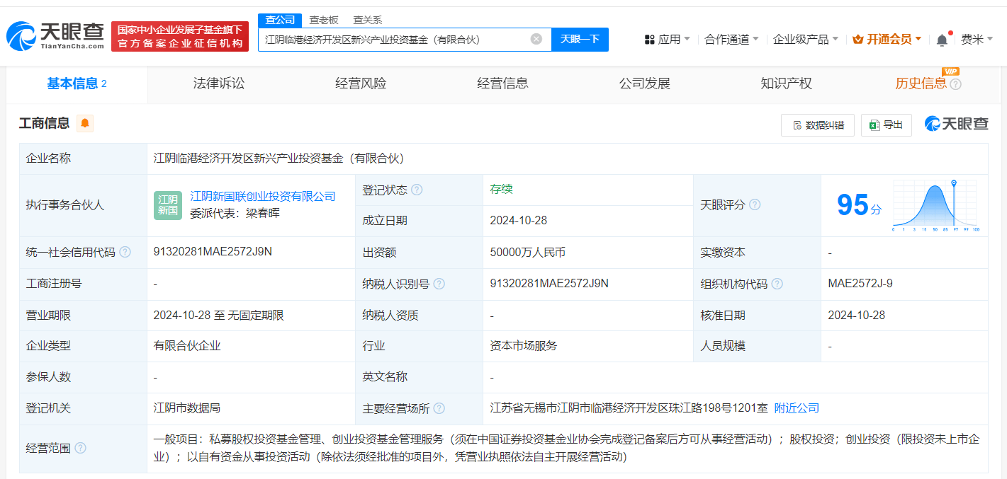 天眼查App信息,近日,江阴临港经济开发区新兴产业投资基金(有限合伙)成立,执行事务合伙人为江阴新国联创业投资有限公司,出资额5亿人民币,经营范围含股权投资、创业投资(限投资未上市企业)、以自有资金从事投资活动等。合伙人信息显示,该基金由江阴新国联创业投资有限公司、江阴惠港投资有限公司共同出资。