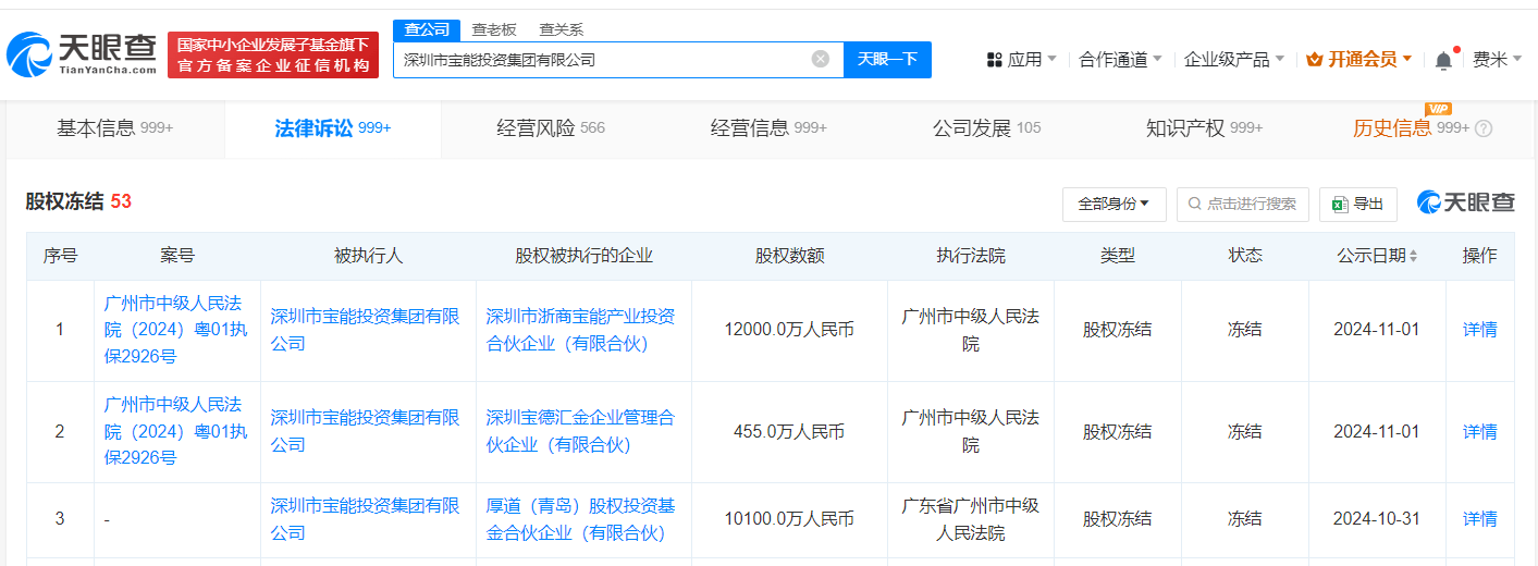 天眼查法律诉讼信息显示,近日,深圳市宝能投资集团有限公司新增3条股权冻结信息,股权被执行的企业分别为深圳市浙商宝能产业投资合伙企业(有限合伙)、厚道(青岛)股权投资基金合伙企业(有限合伙)、深圳宝德汇金企业管理合伙企业(有限合伙),冻结股权数额合计约2.25亿人民币,冻结期限均为3年,执行法院均为广州市中级人民法院。