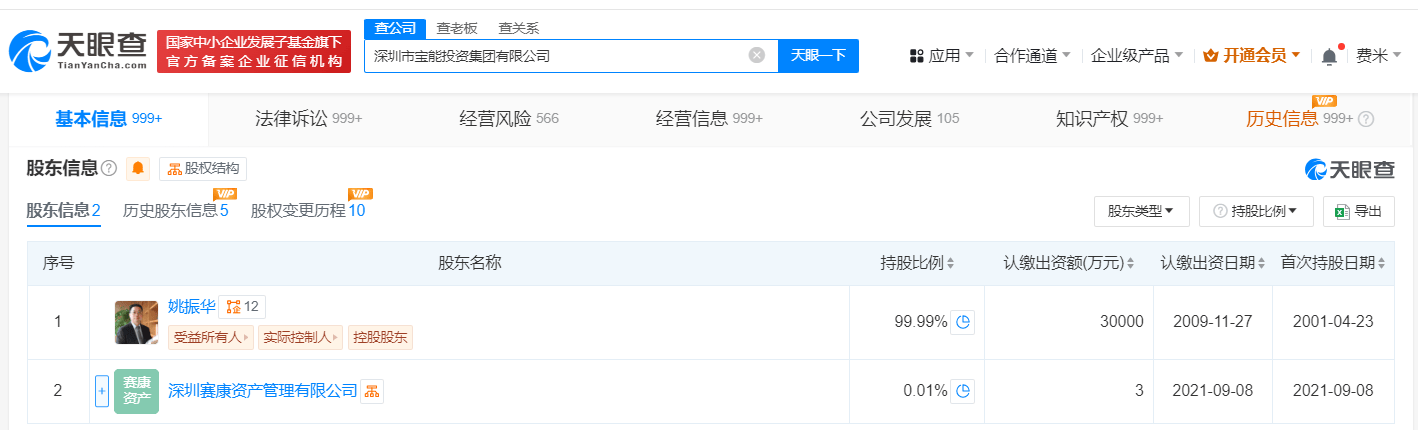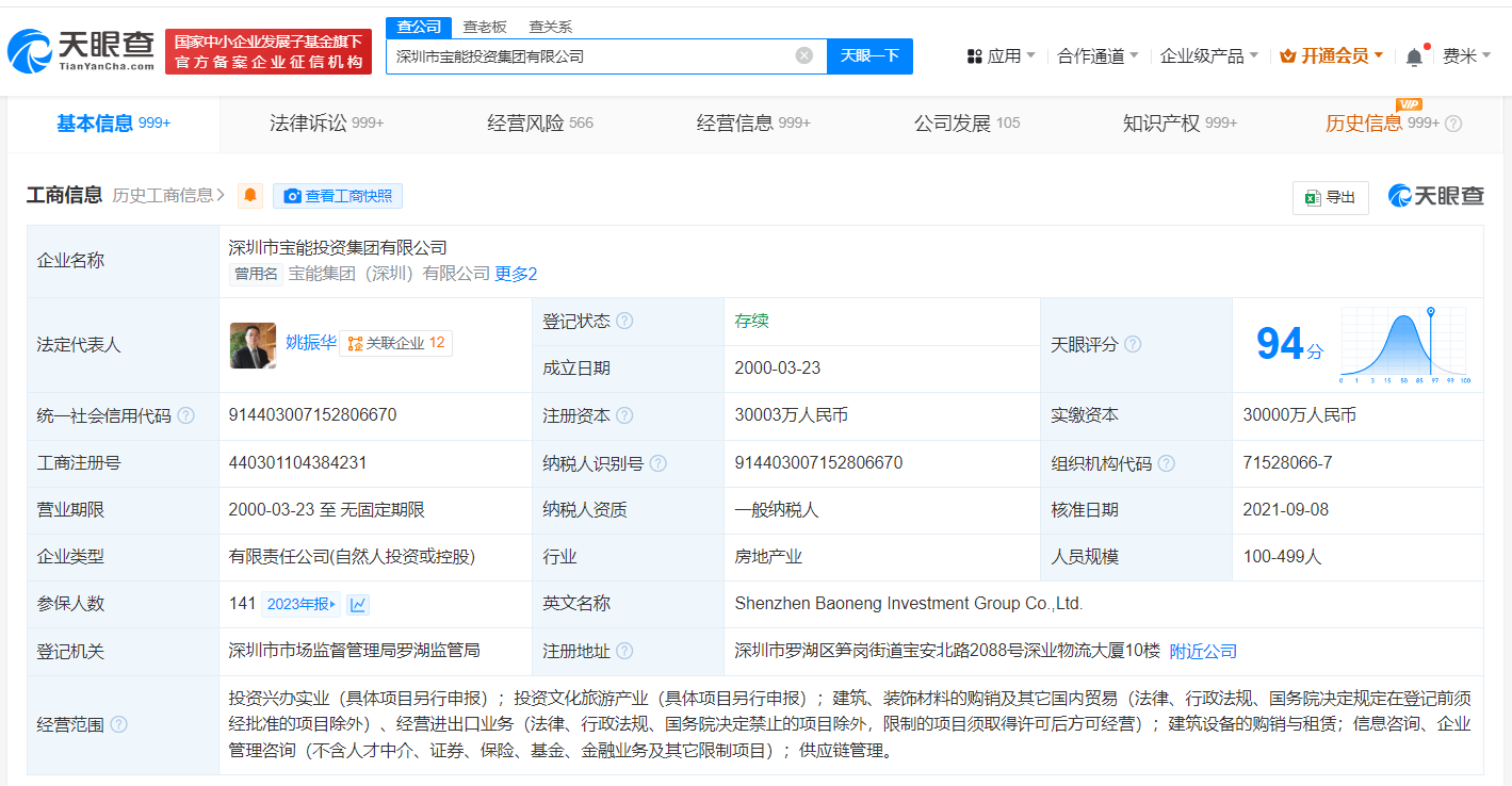 深圳市宝能投资集团有限公司成立于2000年3月,法定代表人为姚振华,注册资本约3亿人民币,经营范围含投资兴办实业、投资文化旅游产业、经营进出口业务等,由姚振华、深圳赛康资产管理有限公司共同持股。风险信息显示,该公司现存多条被执行人、股权冻结及终本案件信息。