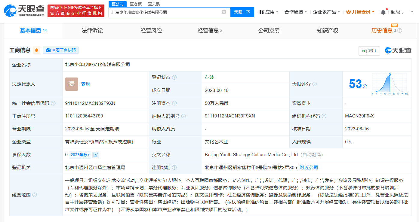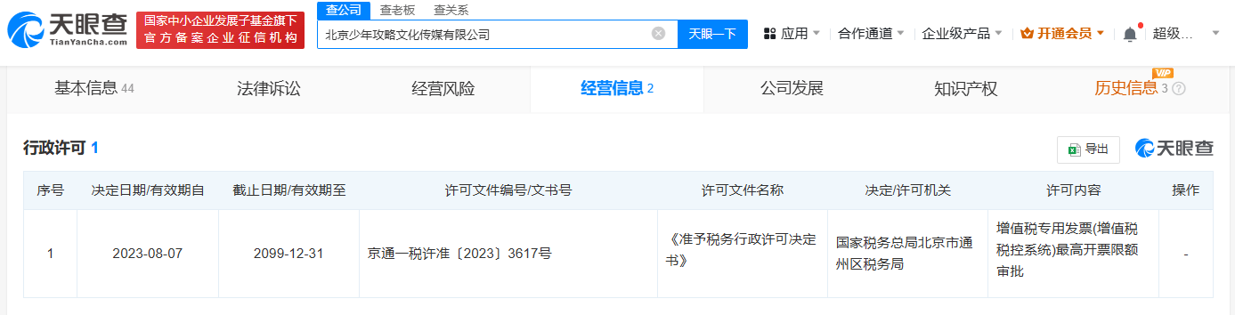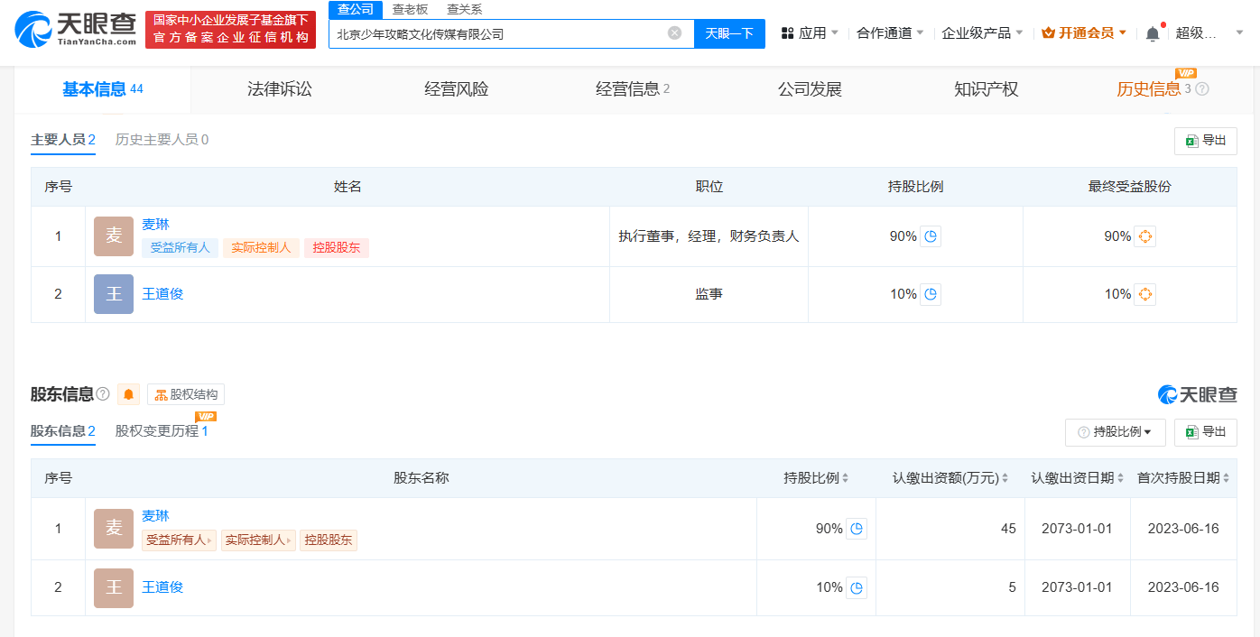 天眼查App显示,北京少年攻略文化传媒有限公司成立于去年6月,注册资本50万人民币,法定代表人、执行董事、经理为麦琳,由麦琳和王道俊分别持股90%、10%。行政许可信息显示,去年8月,该公司已获得增值税专用发票(增值税税控系统)最高开票限额审批。