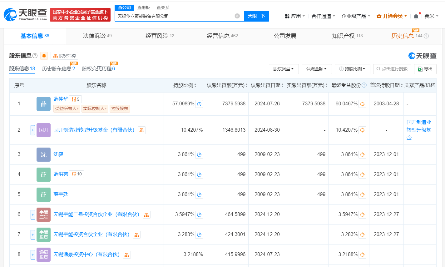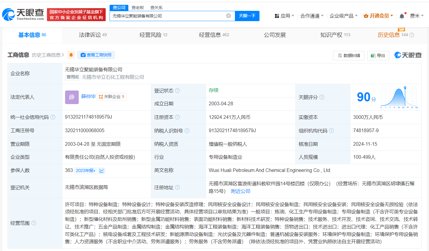 无锡华立聚能装备有限公司成立于2003年4月,法定代表人为薛仲华,经营范围含特种设备制造、民用核安全设备设计、新型催化材料及助剂销售、新材料技术研发、五金产品制造、海洋工程装备制造等,现由薛仲华、无锡宇能投资合伙企业(有限合伙)、无锡宇能二号投资合伙企业(有限合伙)及上述新增股东等共同持股。官网显示,该公司是专业的压力容器及相关装备生产制造厂。