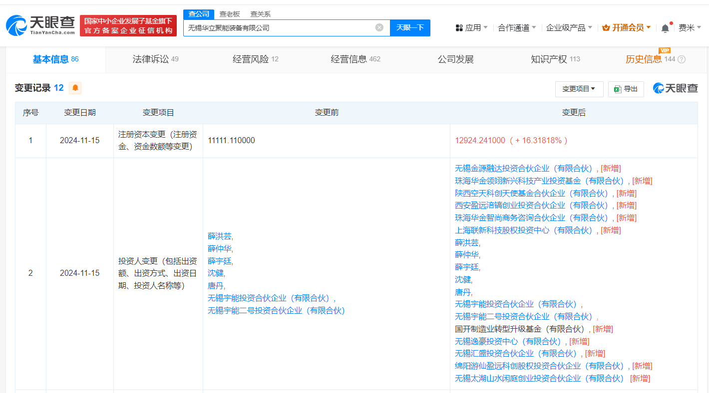 天眼查App显示,近日,无锡华立聚能装备有限公司发生工商变更,新增国开制造业转型升级基金(有限合伙)、无锡金源融达投资合伙企业(有限合伙)、陕西空天科创天使基金合伙企业(有限合伙)等为股东,同时注册资本由约1.11亿人民币增至约1.29亿人民币。