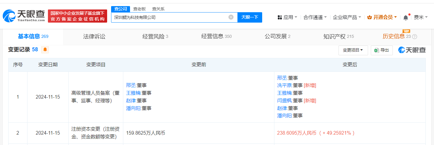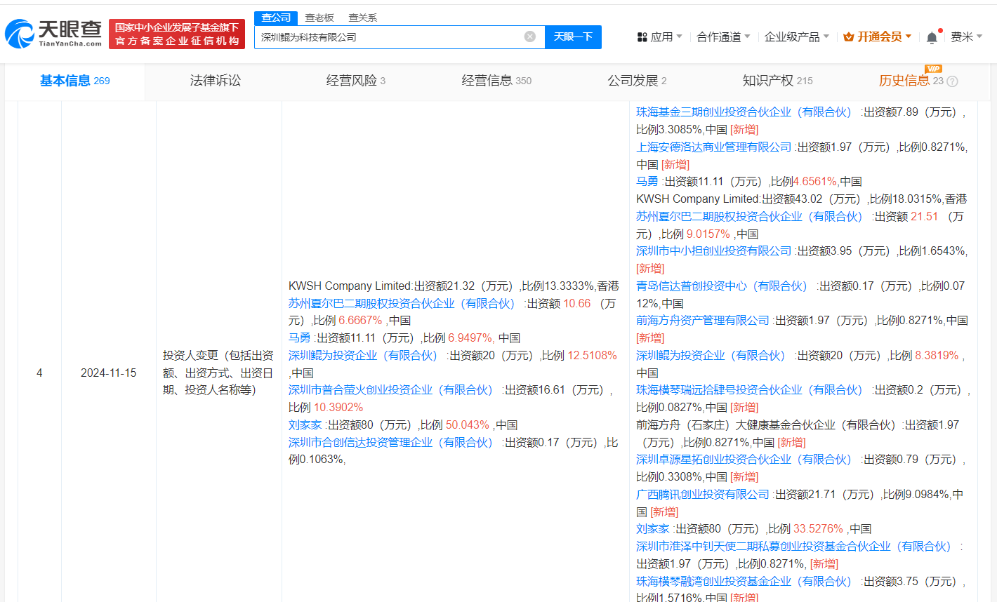 天眼查App显示,近日,深圳鲲为科技有限公司发生工商变更,股东新增广西腾讯创业投资有限公司、珠海基金三期创业投资合伙企业(有限合伙)、深圳市中小担创业投资有限公司等为股东,同时注册资本由约159.9万人民币增至约238.6万人民币。